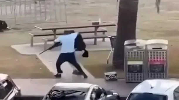 En el mismo video también se observa al segundo tirador en un puente elevado cercano, agachado mientras intercambia disparos con la policía, que se protege detrás de los vehículos. En un momento, el atacante hace señas desesperadas a su compañero ya desarmado para que se acerque al puente.