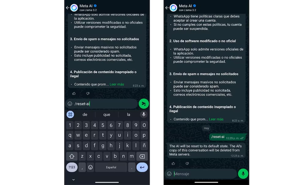 De acuerdo con la página oficial de Meta, los usuarios pueden eliminar los mensajes compartidos con la IA en Messenger, Instagram o WhatsApp enviando el comando “/reset-ai” en cualquier conversación con el asistente.